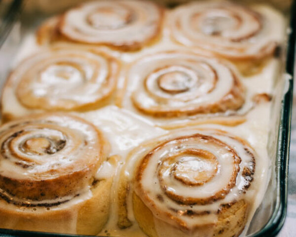 Den Teig auf eine bemehlte Arbeitsfläche legen und mit einem leicht bemehlten Nudelholz zu einem Rechteck von 25×35 cm ausrollen. Den Teig mit weicher Butter bestreichen (je weicher sie ist, desto leichter lässt sie sich verstreichen). Braunen Zucker und Zimt mischen und über den Teig streuen. Den Teig straff zu einer Rolle formen. Schneiden Sie ihn mit einem sehr scharfen Messer in 12 weitere Scheiben. Die Rollen auf dem vorbereiteten Backblech anordnen. Backen Sie die Zimtrollen 22 bis 26 Minuten lang, bis die Ränder leicht gebräunt sind. Wenn Sie bemerken, dass die Ränder zu schnell braun werden, decken Sie das Backblech locker mit Alufolie ab und backen Sie weiter. Das Backblech aus dem Ofen nehmen und die Zimtrollen auf ein Gitterrost legen, während Sie die Glasur zubereiten.